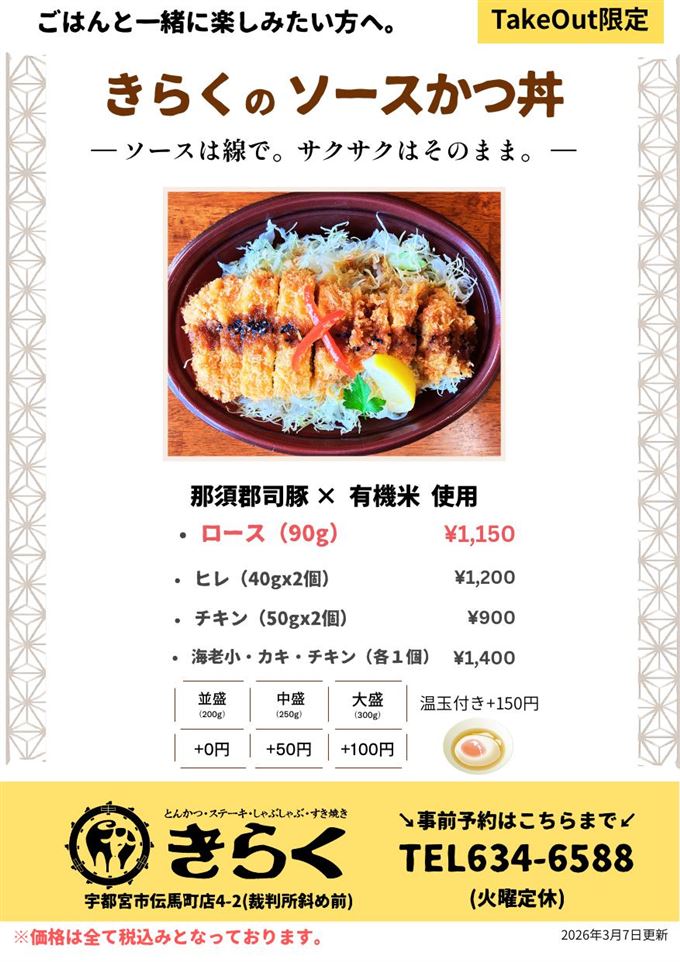 きらくのソースかつ丼がリニューアルしました。那須郡司豚、有機米を使用しています。上からかけるソースを線状にかけることで、サクサク感も楽しめます。